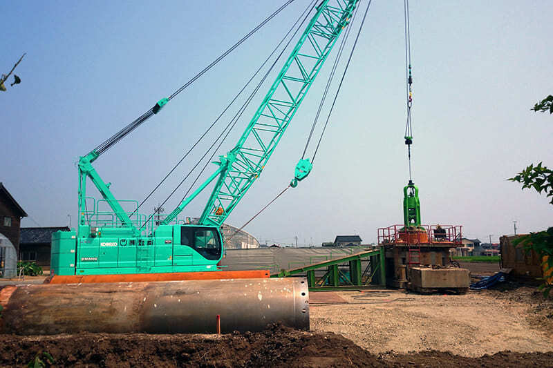 セメントミルク杭の引き抜きです。想定外の土質に苦心していますが、年季の入った機械で頑張っています。