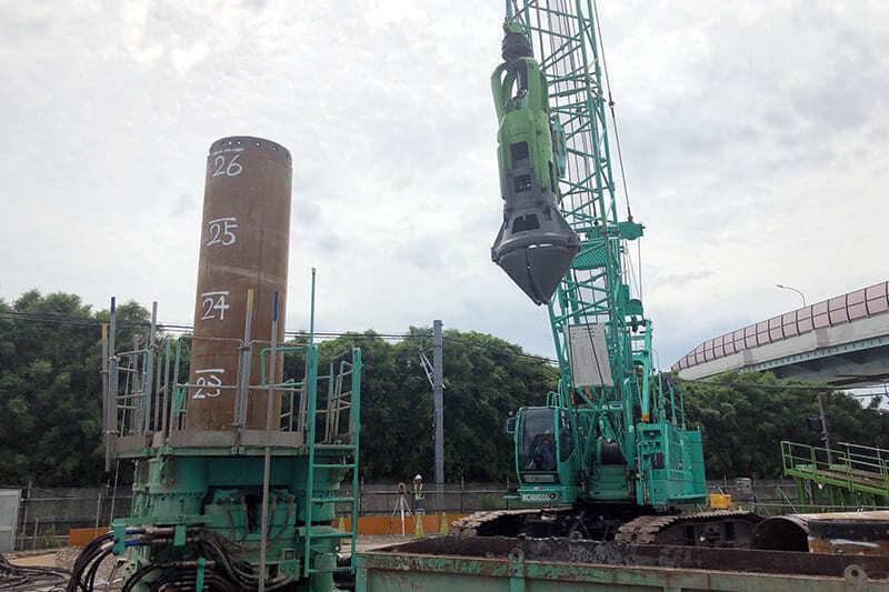 オールケーシング工法は、強力な回転力によってケーシングを回転させ、地中にあるあらゆる障害物や岩盤を掘削する工法です。 あらゆる地層にも対応でき、安全性や耐久性に優れています。垂直精度に優れ長尺杭の施工が可能です。